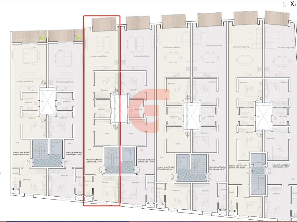 The apartment is located in a tranquil area, complemented by a large communal pool. The typical layout comprises a kitchen/dining/living, 2 double bedrooms, a study, 2 bathrooms (main en-suite), internal yard back balcony. Including this property, there is a one-car garage.